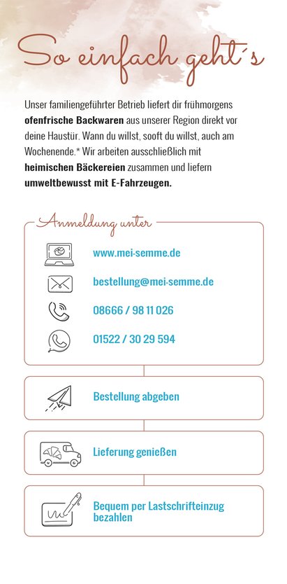 Mit der fertigen Corporate Identity im Gepäck, musste die neue Marke nun nach außen getragen und kommuniziert werden. Hierzu wurden zuerst Türanhänger und Maxikarten gestaltet, die bestehende und neue Kunden über "MeiSemme" informieren sollten.